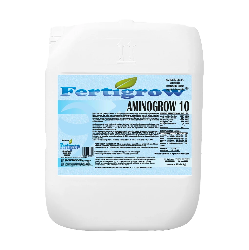 AMINOGROW es un bioestimulante líquido de origen vegetal, formulado con aminoácidos libres y materia orgánica de alta calidad. Su acción se basa en una rápida asimilación por parte del cultivo, actuando de forma eficaz en momentos de estrés biótico o abiótico, como trasplantes, heladas, sequías, salinidad, o daños por plagas y enfermedades.