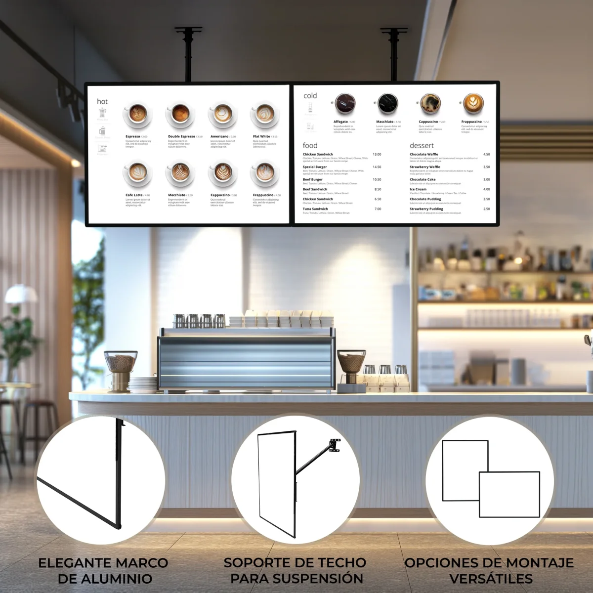 Diseñada para ser versátil, la caja de luz admite orientaciones tanto verticales como horizontales, lo que le permite mostrar su contenido exactamente como lo necesita. También ofrece opciones de instalación flexibles, ya sea que prefiera el montaje en la pared o la suspensión del techo. Con un soporte de suspensión para techo de 1m y un práctico kit de fijación incluidos en el paquete, adaptarse a tus requisitos específicos de visualización es rápido y fácil.