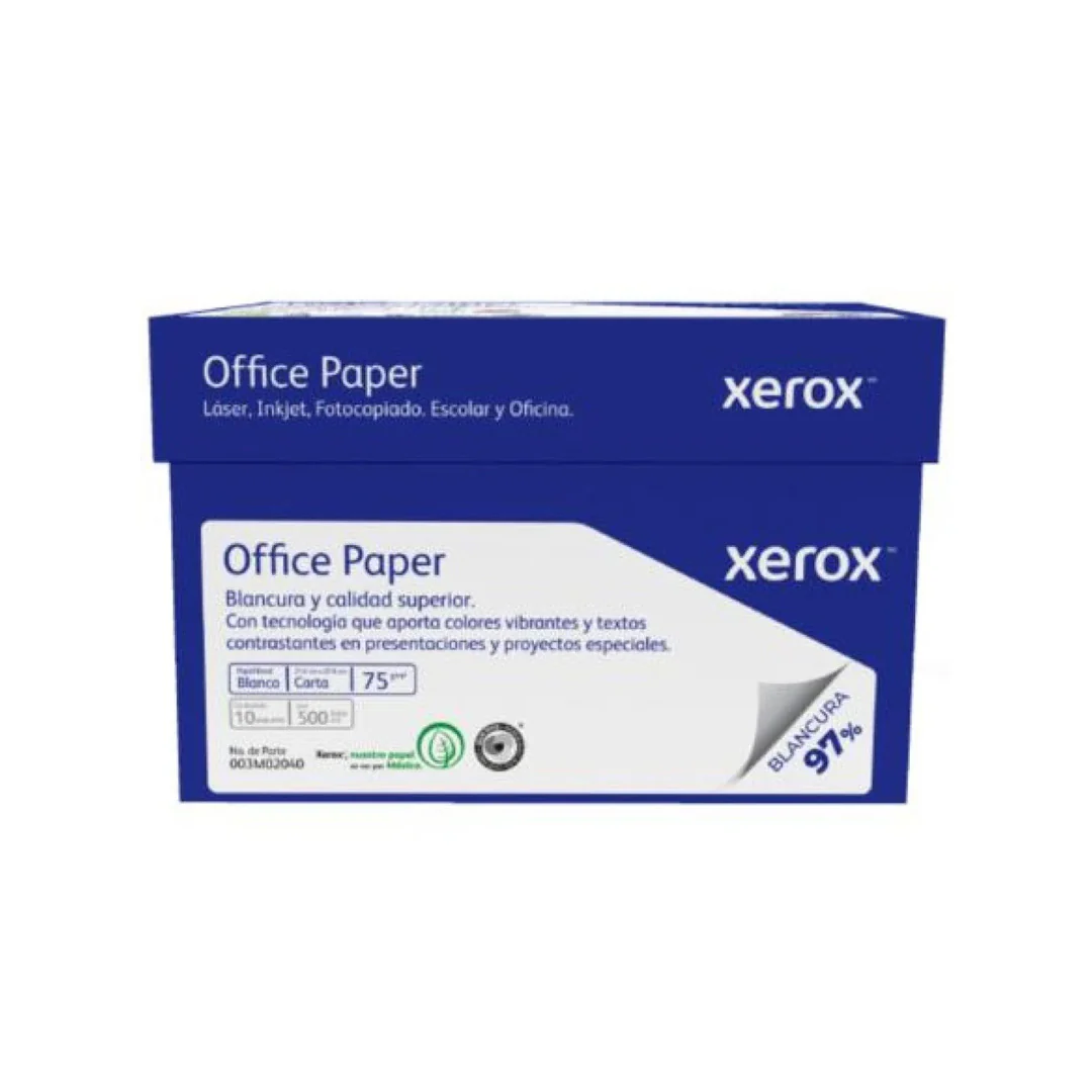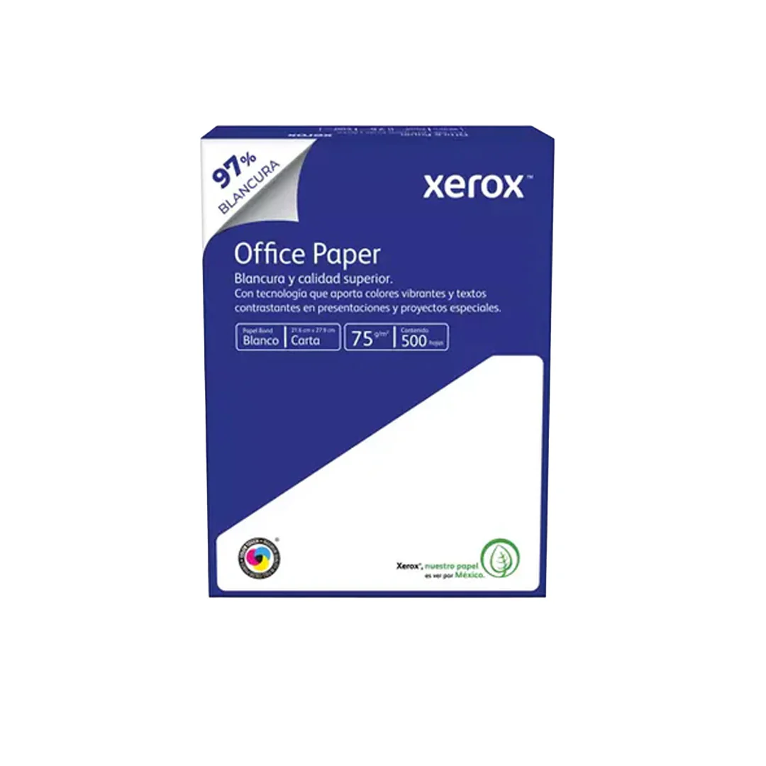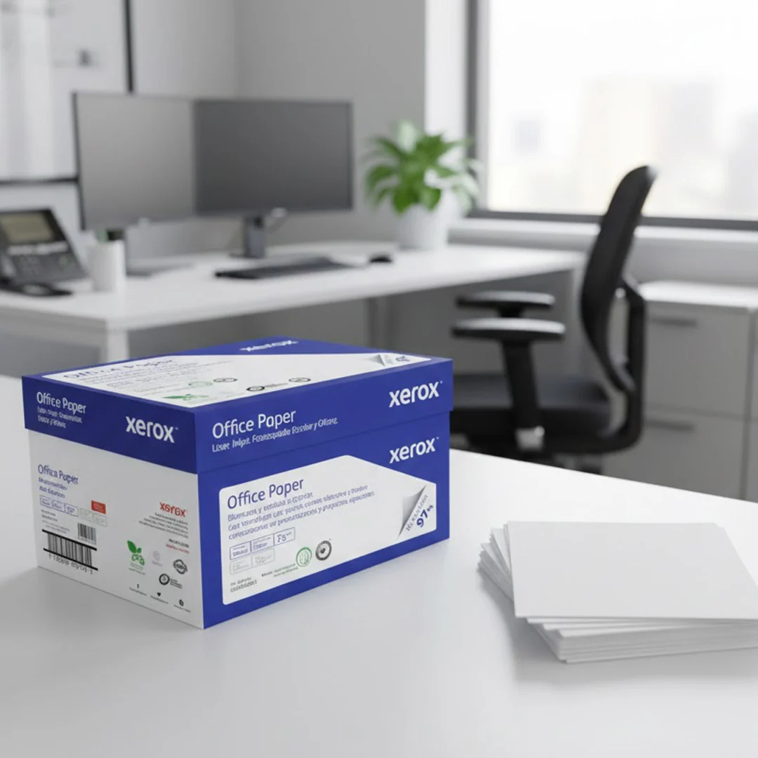 Papel bond multifuncional Xerox Office Paper en presentación de caja, ideal para impresión y copiado intensivo en oficina gracias a su blancura 97% y calidad consistente en equipos láser, tinta y copiado.