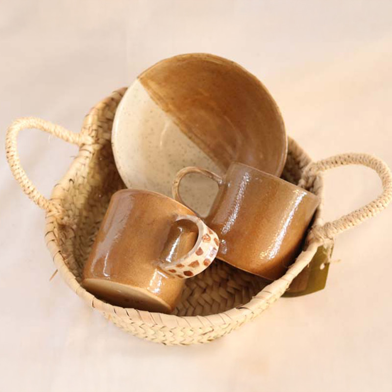 Piezas hecha con gres de alta temperatura con esmalte libre de plomo, aptas para contener alimentos o bebida.