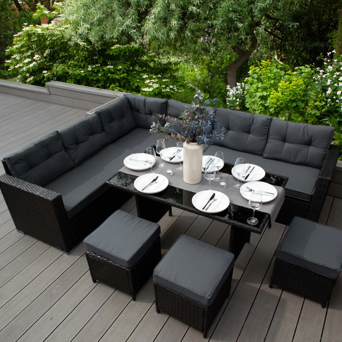Eleve su oasis al aire libre con nuestro exclusivo conjunto de sofá esquinero de ratán y caja de almacenamiento para jardín, una fusión perfecta de elegancia, comodidad y funcionalidad. Deléitese con el epítome del lujo con nuestro conjunto de muebles de ratán para esquina de 6 plazas, de la exquisita gama Jardí. Este conjunto de comedor, que consta de un sofá esquinero, 3 taburetes y una mesa con tapa de vidrio, está meticulosamente diseñado para un estilo y comodidad óptimos. Protegido por una capa UV, este conjunto está diseñado para afrontar los distintos elementos a lo largo del año, conservando su impresionante color.