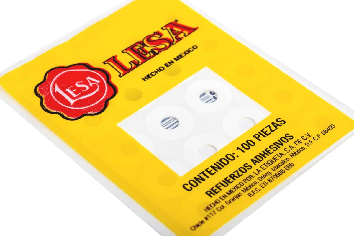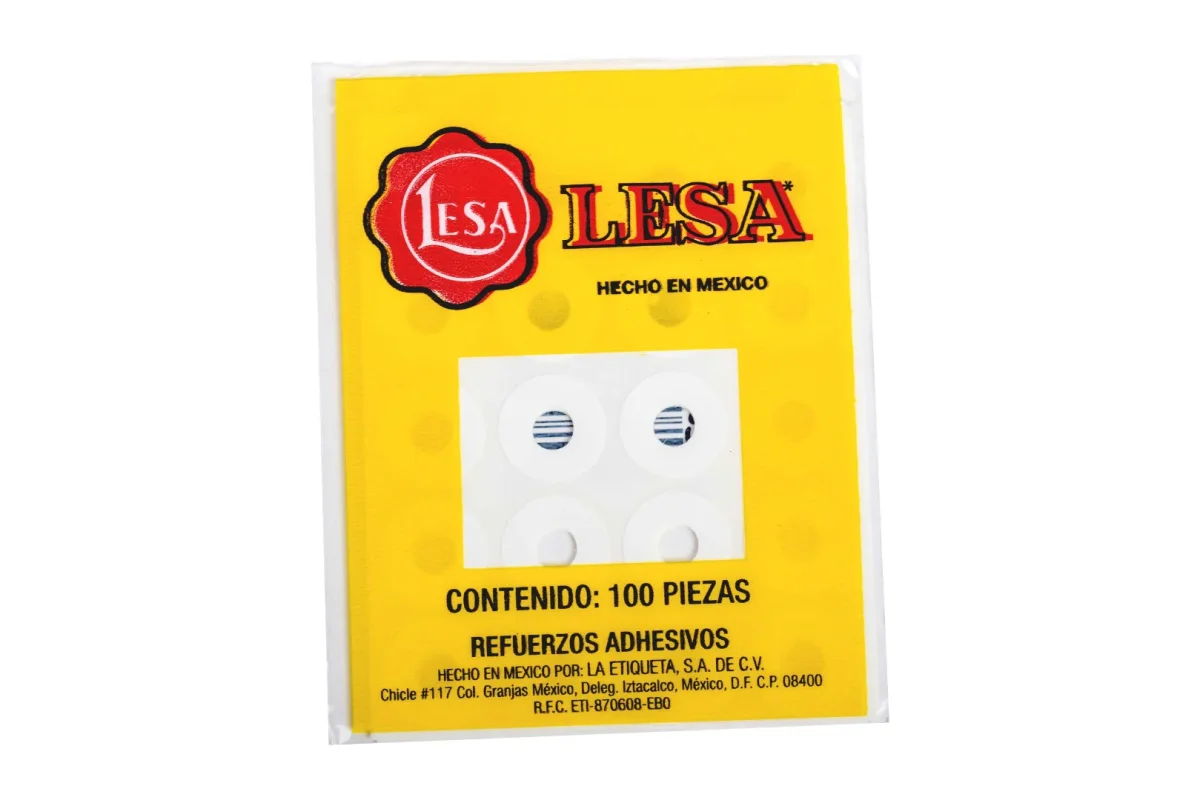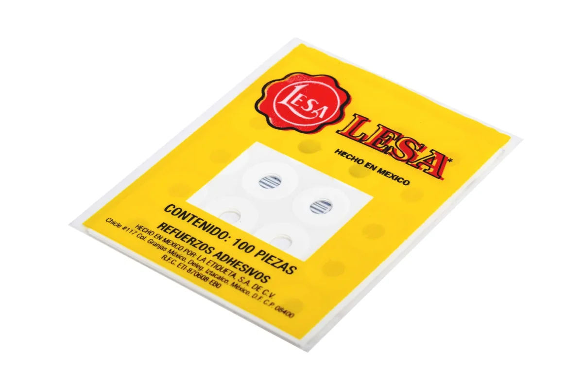 Paquete con 100 refuerzos adhesivos para carpetas que se pegan a la perfección y fijando las hojas por completo.