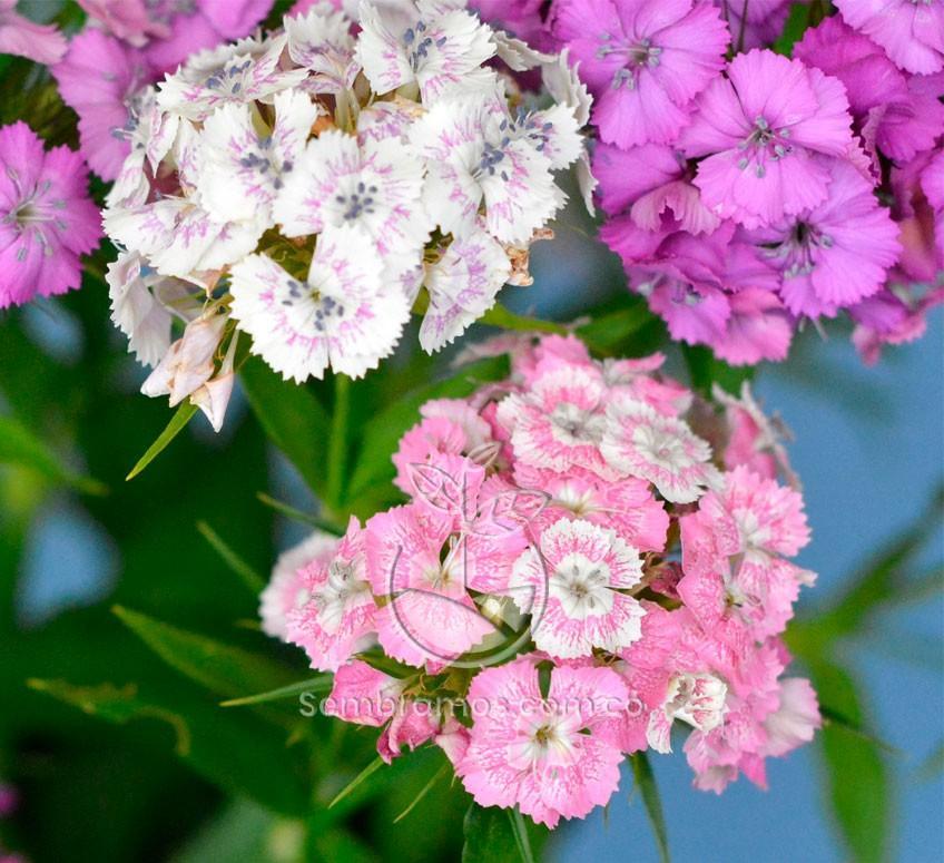 Dianthus Barbatus. Bianual. Mezcla Standard doble talla. En clima frío crece como planta anual y en clima cálido puede ser perenne. Plantar en lugar soleado en suelo de pH ligeramente alcalino muy bien drenado. Necesita de un riego diario. Es recomendable aplicarles fertilizantes a base de Fósforo y Potasio, al igual que incorporar materia orgánica al sustrato. Se Siembra en maceteros a una profundidad de 1 cm. Las plantas perennes duran largo tiempo con atención adecuada. Tener especial cuidado en el manejo de semillas pequeñas, para no perderlas. En climas cálidos evitar la siembra en lugares que reciban demasiado sol.