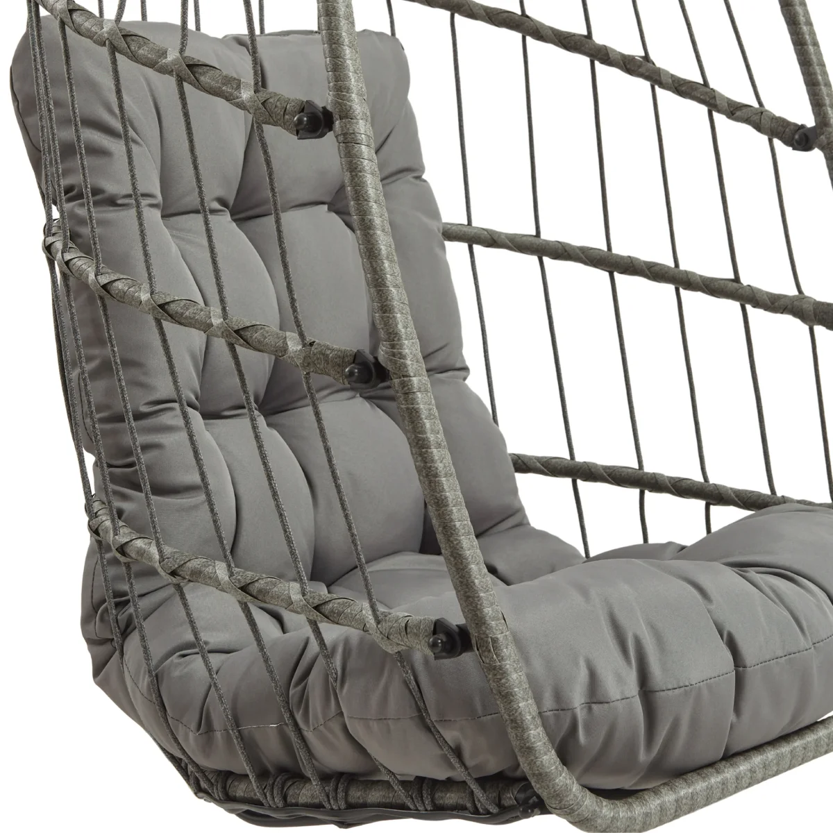 Relájate con estilo con esta bellamente diseñada silla colgante tipo huevo de ratán gris, el complemento perfecto para cualquier jardín, terraza, balcón o espacio interior.