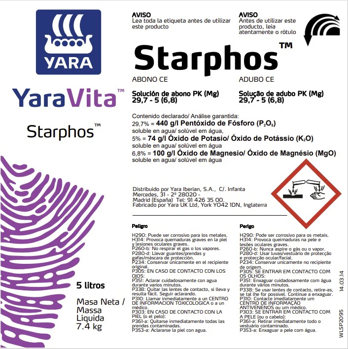 YaraVita Starphos es una solución concentrada activa en fósforo de alta disponibilidad. El contenido en potasio y magnesio de YaraVita Starphos le confieren un efecto sinérgico con el fósforo. YaraVita Starphos es un producto formulado aplicable tanto por vía foliar como en fertirrigación, destacando en el primer caso por su rapidez, seguridad y mezclabilidad en tanque con otros agroquímicos, evitando aplicaciones específicas y propiciando un ahorro en tiempo y dinero.